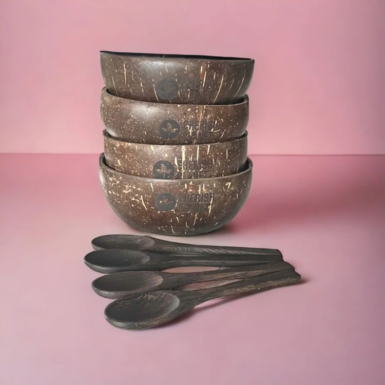 Crafted from natural coconut shells, each bowl is unique in texture and colour, adding an eco - friendly touch to your dining experience. Accompanied by four handcrafted wooden spoons, this set embodies the harmony of nature and functionality, perfect for serving up your favourite dishes to friends and family with a dash of rustic charm.