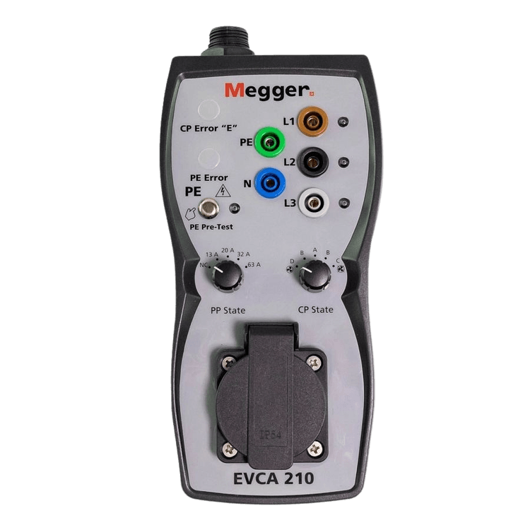 The Megger EVCA210/EVCA210-UK test adaptors are designed to simulate the connection of an electrical vehicle to the charging point under test. Connection of the adapter enables the operator to trigger the charging process by selecting the appropriate Proximity Pilot (PP) and Control Pilot (CP) states. Test instruments can be connected using either the front mounted mains socket or the 4 mm connection ports L1, L2, L3, N, PE. Two additional CP signal terminals give the operator the ability to measure the CP signal using an oscilloscope.