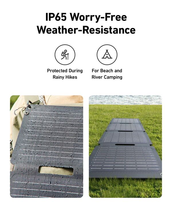 IP65 Weather-Resistant Protection: Rain or shine, Anker PS30 Portable Solar Panel withstands various weather conditions, always delivering power. Perfect for camping, hiking, and outdoor activities.