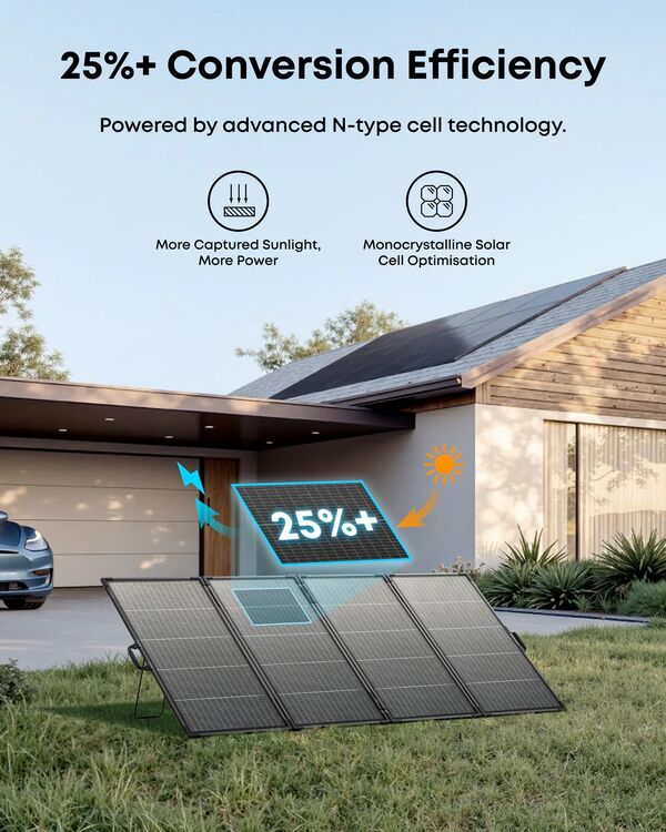 • Lightweight Design, Foldable Convenience: Now 10% lighter than the previous version—just 10 kg including the stand. Over 50% lighter than typical 400W panels, making it easier than ever to carry and set up.