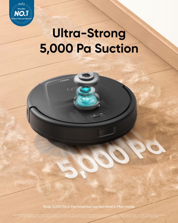 Ultra-strong 5,000 Pa suction effortlessly removes hair, crumbs, and dust are effortlessly removed in...